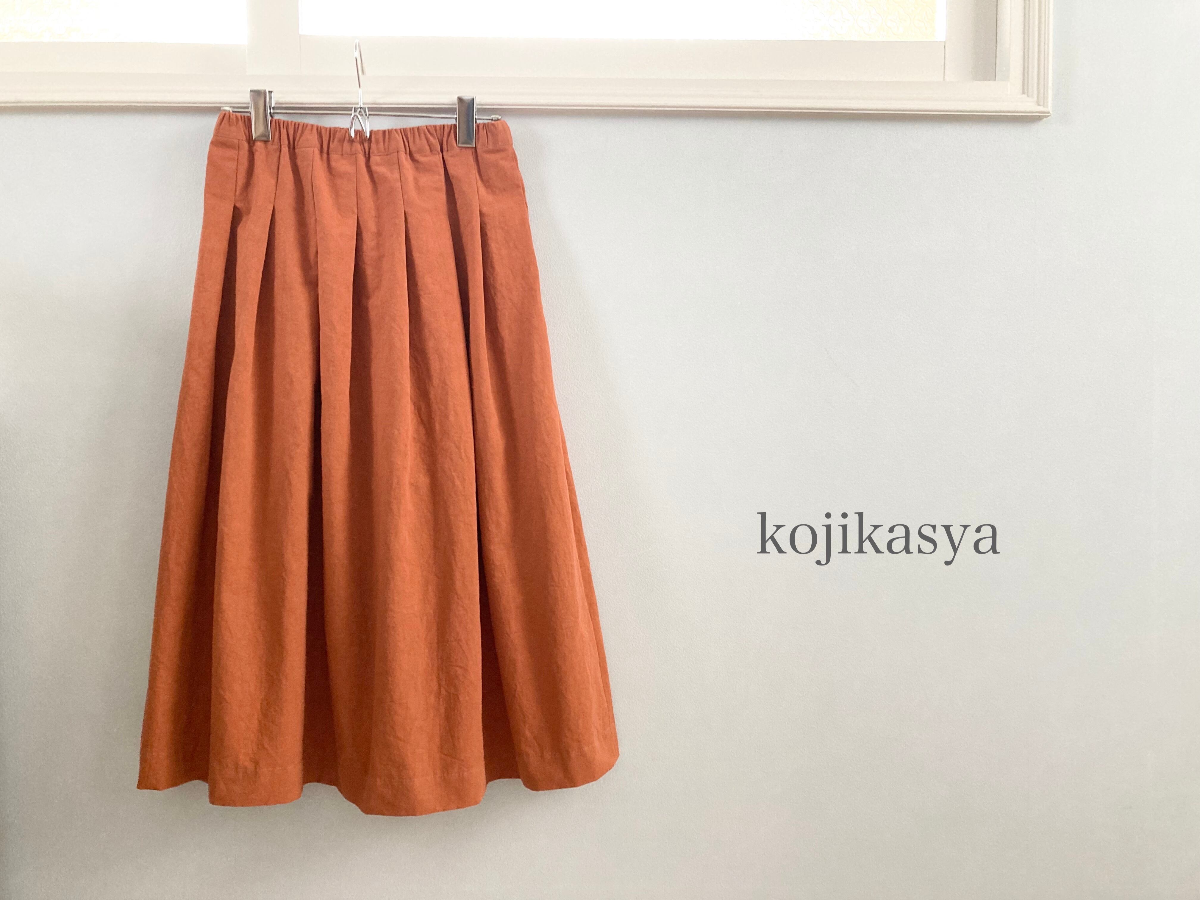 仔鹿舎のスカートは細かくタックを取り、ヒップが通過するギリギリの筒状にしてからウエストゴムを入れておりますので、腰回りで生地がもたつかずすっきり見えます☆