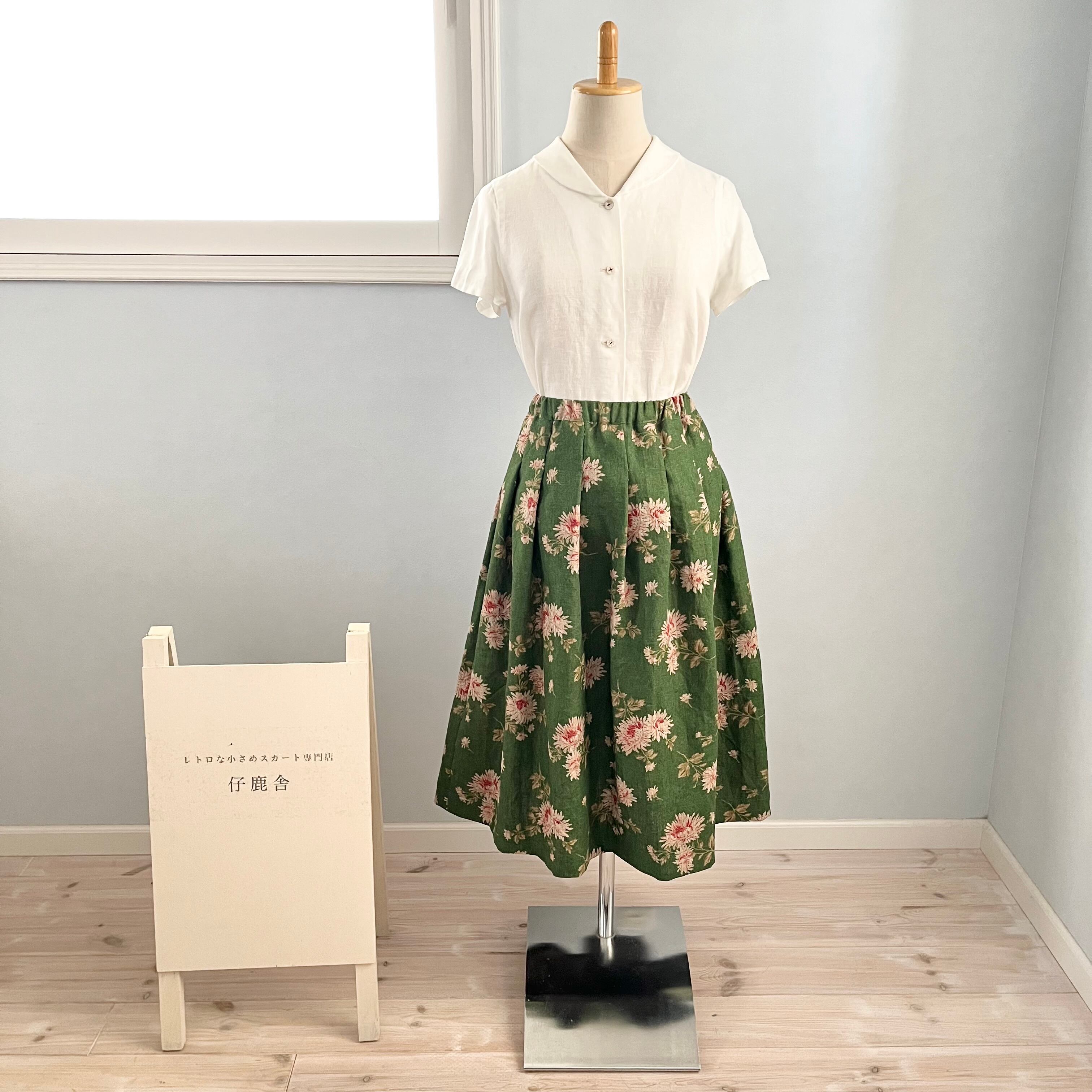 【受注製作】リネン100% グリーン×花柄 アンティークな雰囲気漂うリネンスカート