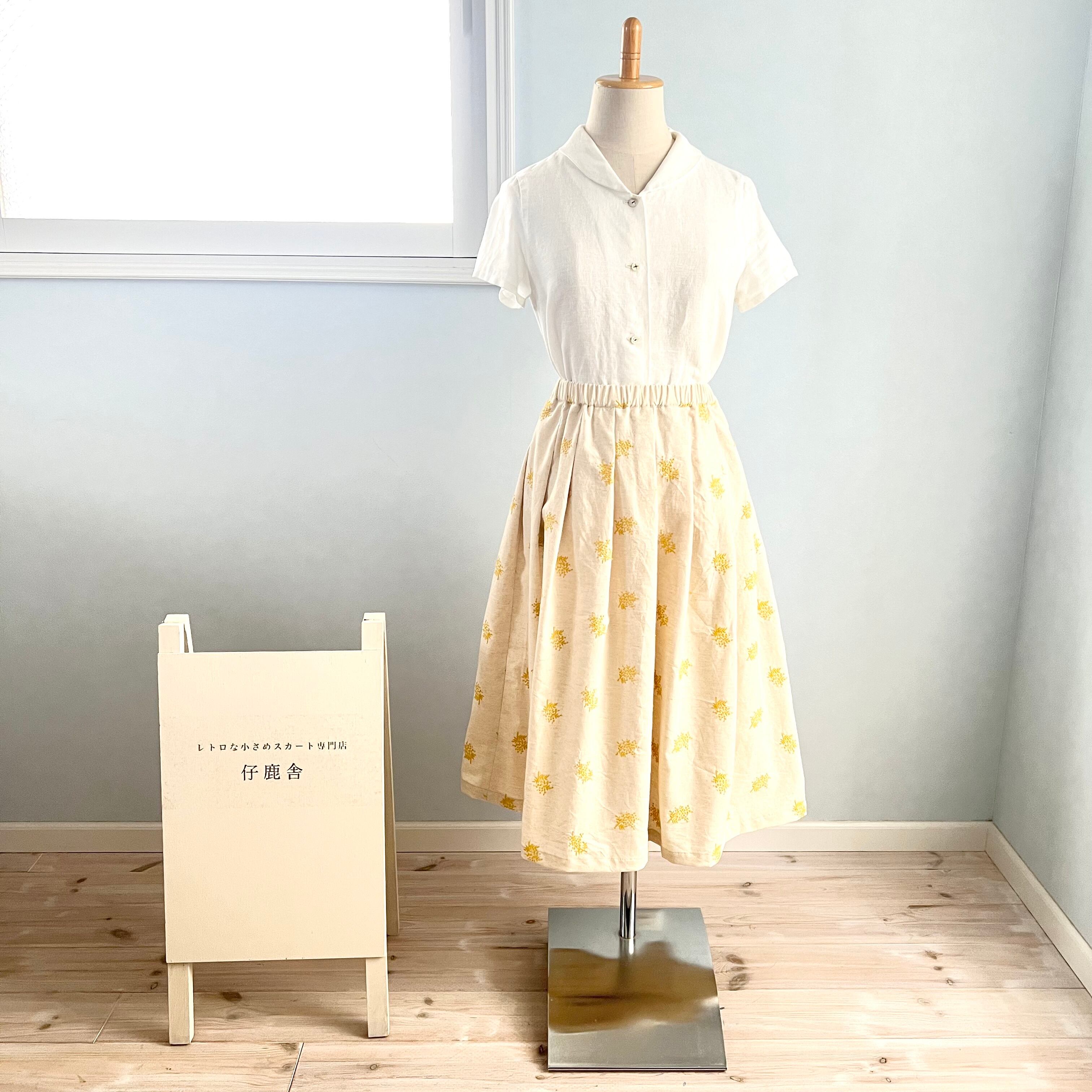 春。ミモザの刺繍が可愛いコットンリネンスカート Sサイズ
